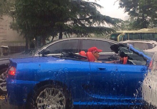 现象:男子暴雨中开敞篷车 笑翻过路人