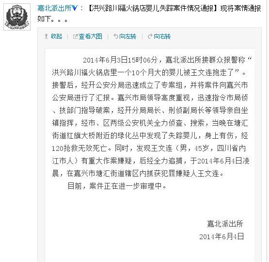 中新网6月4日电 据浙江嘉兴市公安局嘉北派出所官方微博消息,2014年6月3日15时06分,嘉北派出所接群众报警称“洪兴路川福火锅店里一个10个月大的婴儿被王文连抱走了”。