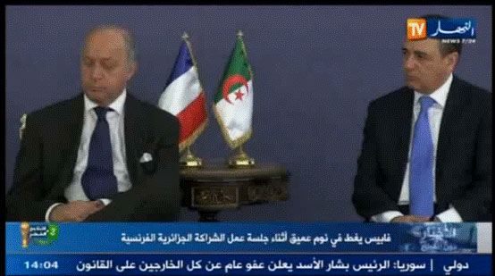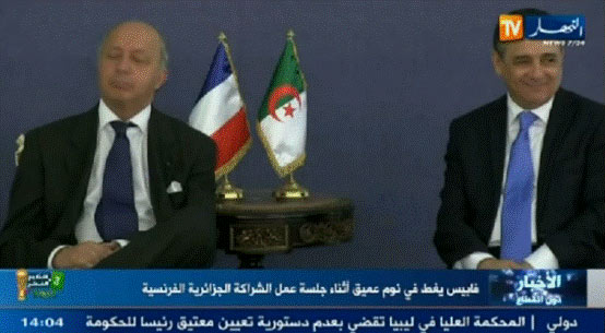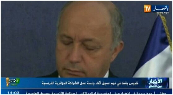 【环球时报综合报道】据法国《巴黎人报》10日报道,法国外长法比尤斯9日在阿尔及利亚首都阿尔及尔出席法国与阿尔及利亚经济合作会议时频繁打瞌睡,被阿尔及利亚一家私人媒体拍成视频,后被法国媒体发到网站上,引起网友议论。视频显示,虽然法比尤斯在会上几次试图让自己保持清醒,但困意袭来,他还是瞌睡不断。
