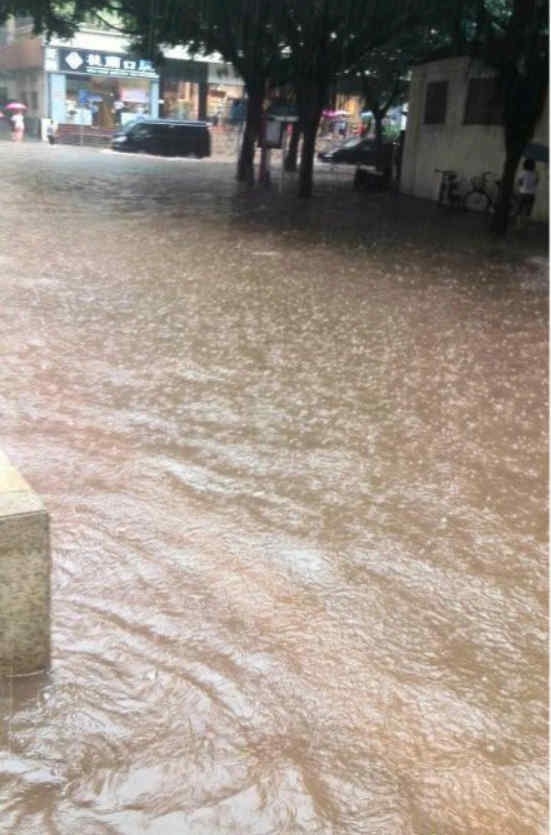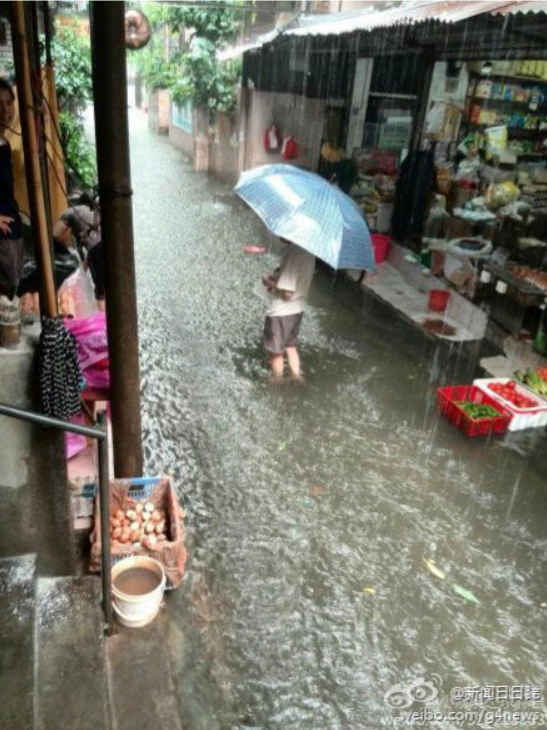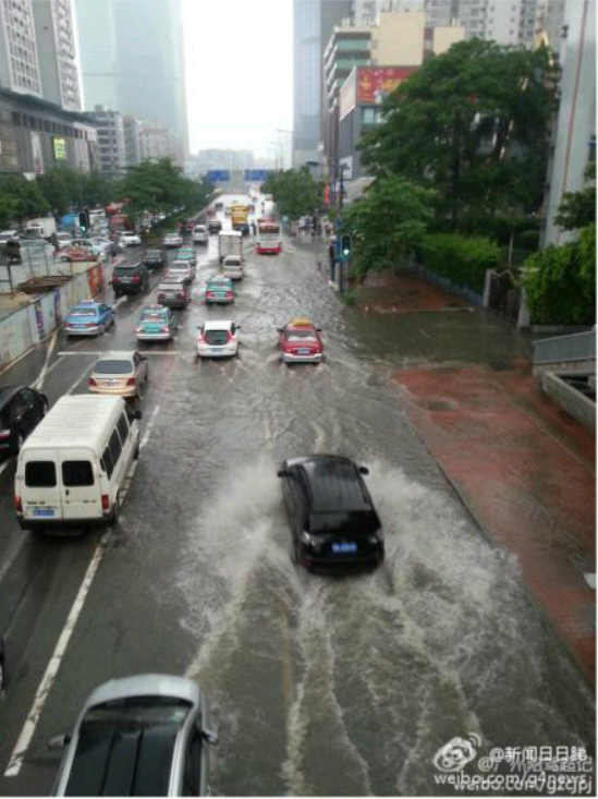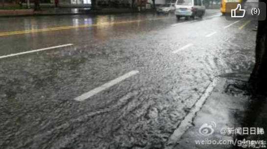 时刻新闻 —分享— 微博截图 【广州暴雨多处水浸 你有没有“在水中央”】@广州天气 : 11日12时03分起,越秀、荔湾等地方暴雨黄色预警信号生效,很多市民“倒泻箩蟹”,被暴雨“所困”…… 图片来自网友。 来源:大洋网-广州日报 编辑:蔡娟