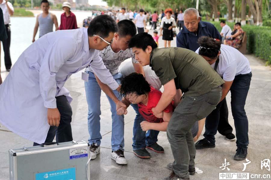 15点20分,记者闻讯赶到建设桥时,前期赶到现场的库尔勒市公安消防大队新城中队的消防官兵正驾驶冲锋舟在河面上搜寻失踪的西尔艾力·艾比。河中央的小岛上,被民警救起来的年轻男子茫然地看着河中的搜救官兵,而刚刚从河水中救起的女子被民警抬上岸,因为喝水太多,腹部明显隆起很高。