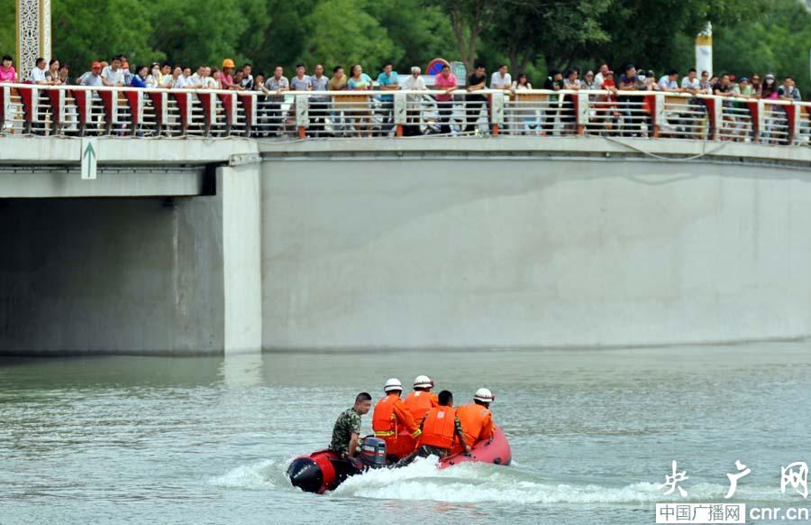 消防官兵驾驶冲锋舟搜寻失踪的西尔艾力·艾比(央广网发 达林塔 摄)