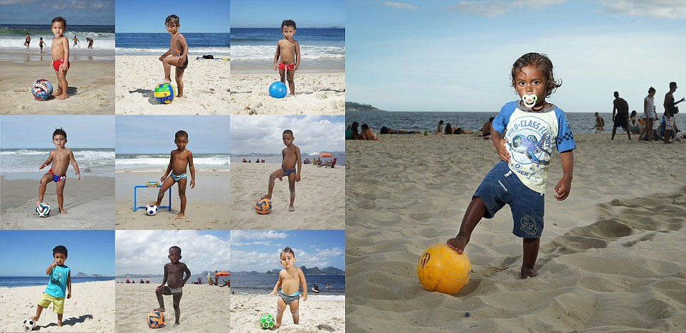巴西足球从娃娃抓起。里约海滩不乏踢足球的幼童。(网页截图)