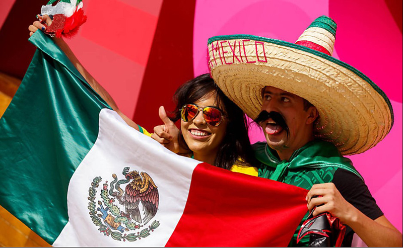 球迷狂欢节上,墨西哥球迷身带传统配饰大草帽,手中拿着国旗为墨西哥队助威。(网页截图)