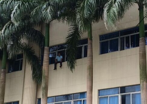 南海网海口6月13日消息今天上午10点左右,在海南金盘某通信公司办公楼三楼,一男子爬上窗口欲跳楼,并在微博上直播自己将要跳楼。截止目前,公安,消防,救护车辆都已经在现场。