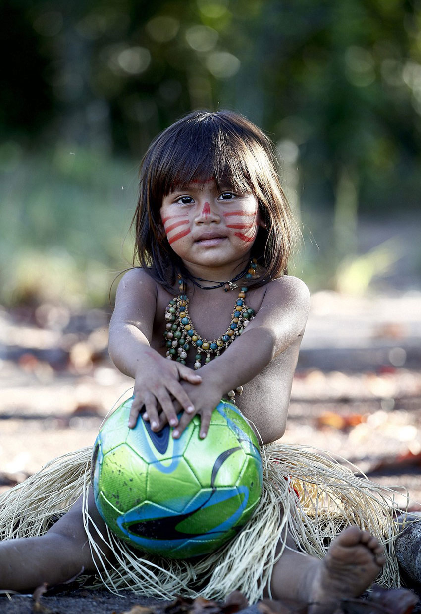 巴西亚马逊雨林塔图约部落一个女孩怀抱足球。(网页截图)