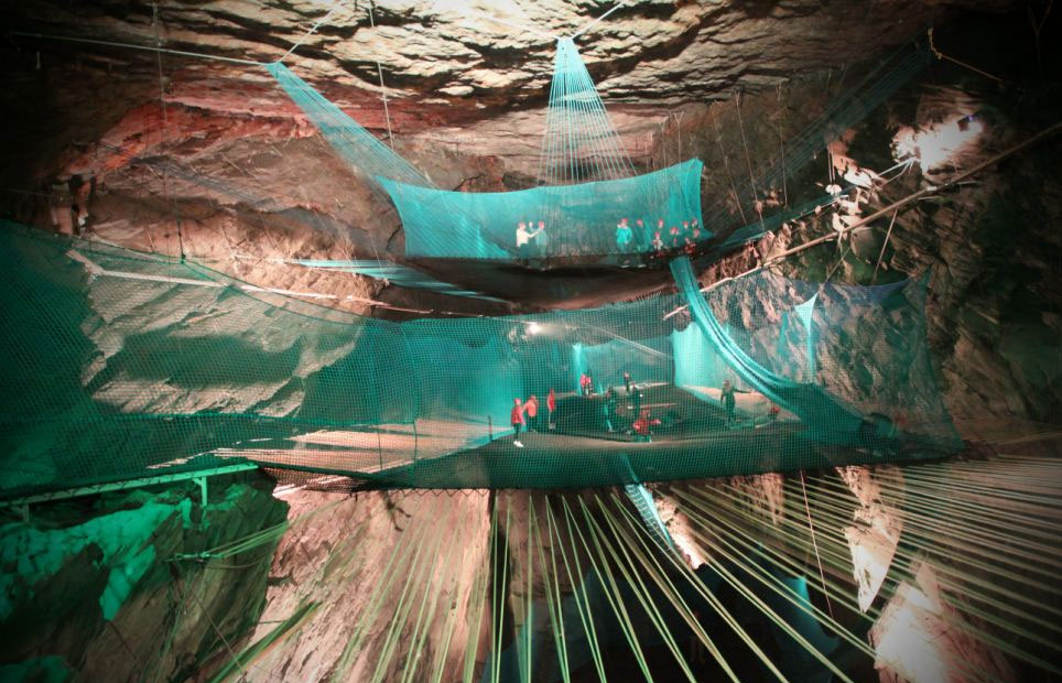 国际在线专稿:据英国《每日邮报》6月16日报道,位于英国北威尔士采石小镇布莱奈·费斯蒂尼奥格(Blaenau Ffestiniog)的Llechwedd岩洞正在被改造成世界上最大的地下蹦床,并将于7月3日开放,成为当地吸引游客的新景点。
