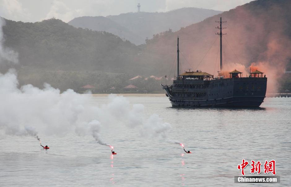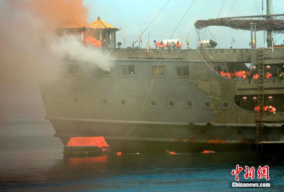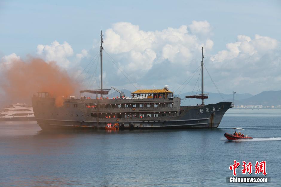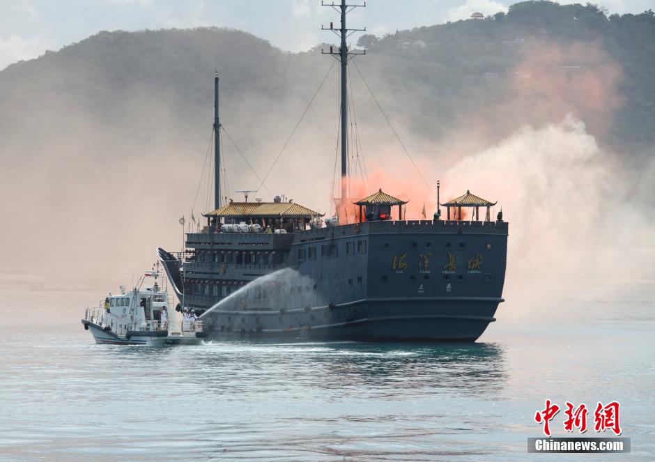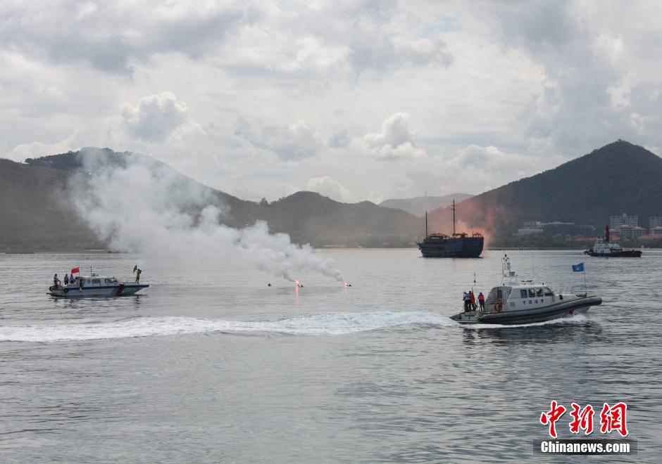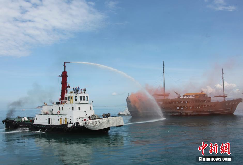 6月18日,三亚市政府和海南省海上搜救中心在三亚联合主办海上客船消防与救生演习,这是海南地区首次大型旅游船弃船演习。整个演习时长1小时,按海上实际遇险处置情况设置场景,检验海上突发事件应急处置能力和船舶自身的应变能力。本次演习共有三亚地区17艘海上公务船和旅游公司船舶参与,承担弃船任务的“海通号”是目前海南地区最大的旅游船(450客位)。图为演习现场。中新社发 尹海明 摄