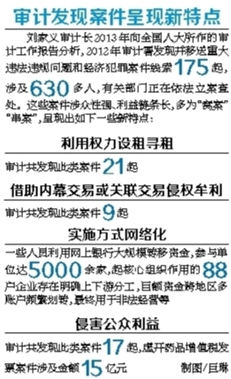 如审计长刘家义在2013年6月27日向全国人大常委会作的审计工作报告就指出,2012年审计发现并移送重大违法违规问题和经济犯罪案件线索175起,涉及630多人。这些案件涉众性强、利益链条长,多为“窝案”、“串案”,呈现出一些新特点,有的利用权力设租寻租,有的借助内幕交易或关联交易侵权牟利,有的实施方式网络化,有的侵害公众利益。