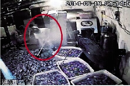 图为:监控视频里工人踩在肉制品上
