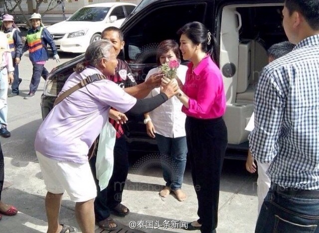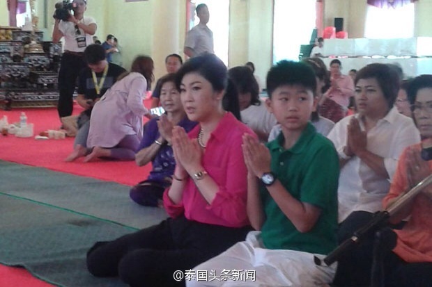 @泰国头条新闻:6月21日是泰国前总理英拉的47岁生日。当日上午,英拉携爱子一起,来到住所附近的BengThongLang寺院按照泰国的风俗礼佛布施,为自己的生日祈福。这是自政变来英拉第一次公开在媒体前亮相,周边的民众得到消息纷纷赶到寺庙等候,为英拉送上鲜花给她打气加油。