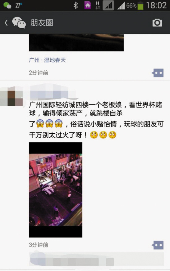 “世界悲!昨天广州某轻纺城4楼,一位年轻女老板纵身飞下跳楼,了结一生,赌世界杯赌到破产!”昨日,这样一条消息在微信朋友圈和微博上疯传。大家或悲悯或激愤,不少人转发了此“消息”并多番感慨,称“人若赢得全世界,赔上自己的性命,又有什么意义”,劝玩球的人别太过火。还有网友表示,今年的世界杯,身边人不是看球赛,而是在赌球、赌命,“总是输不起的才赌注下得大。”认为拿命赌球简直“活该”。