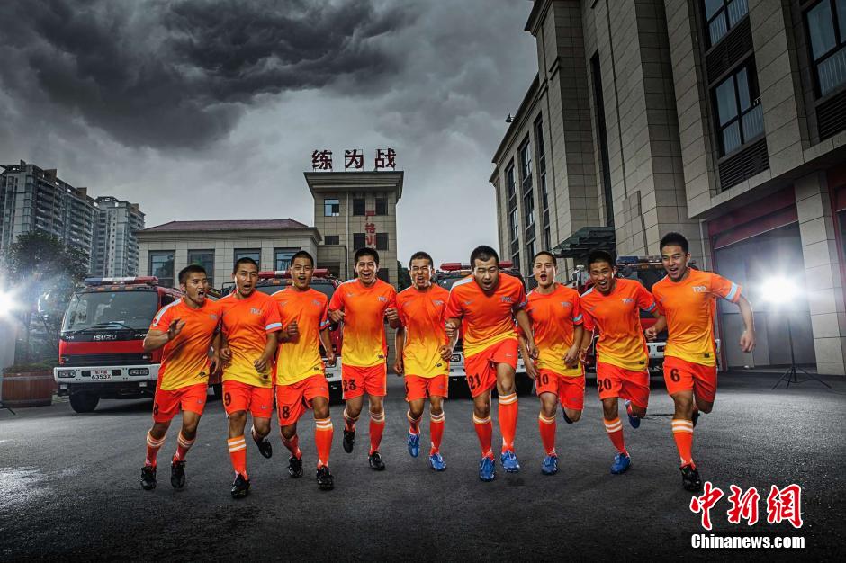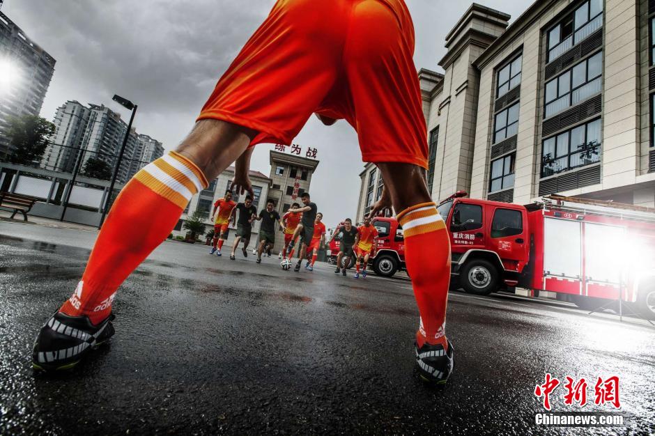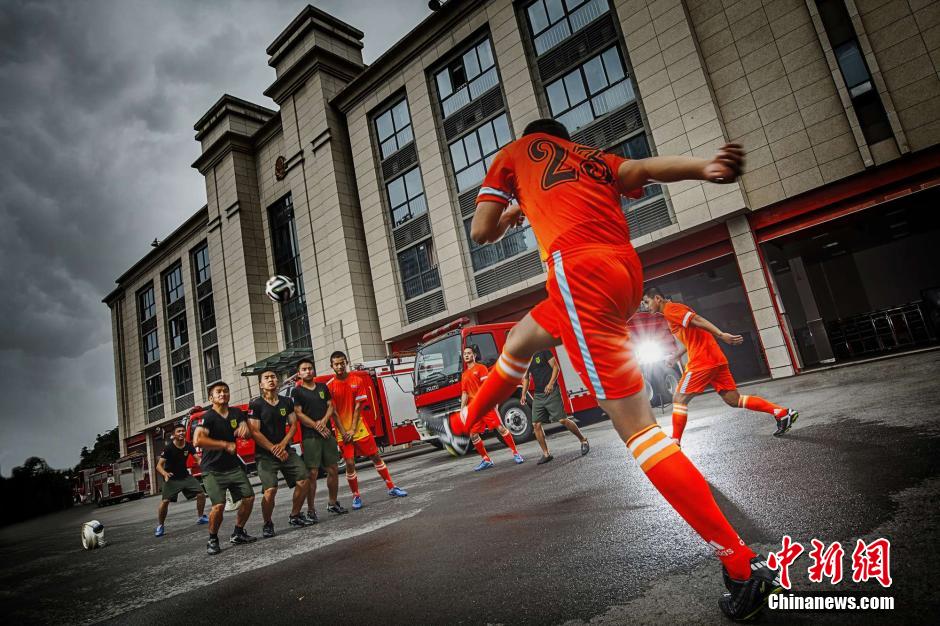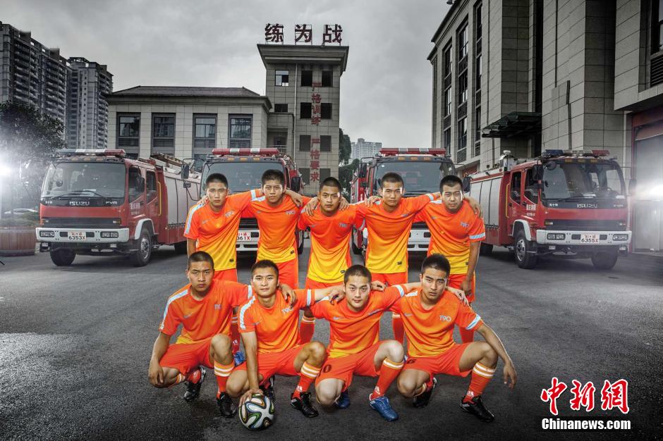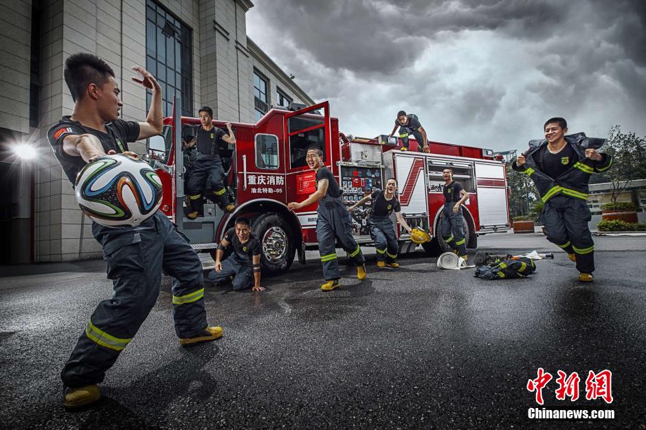 6月23日,重庆渝北区消防支队发布一组消防官兵在“世界杯”期间拍摄的足球形象照。渝消防 摄