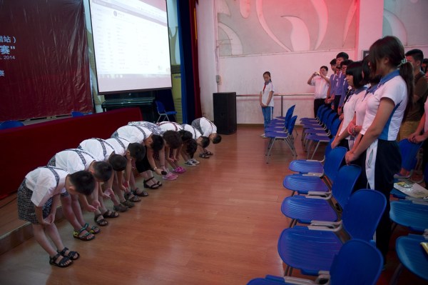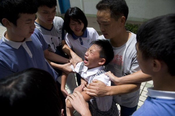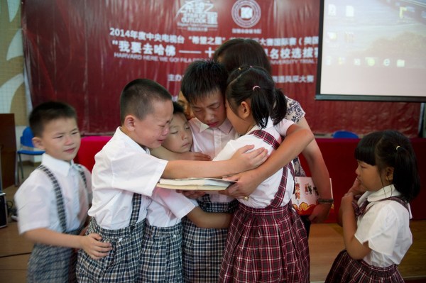 学生们紧追不放,几个女生把广西电视台记者堵住,不停问“他不是说不想回去吗,你们干吗还要把他带走”,记者也无言以对。在宿舍楼下,7岁的曾繁荣和几个国学班的小伙伴,因为追赶不上,坐在楼道上,号啕大哭。