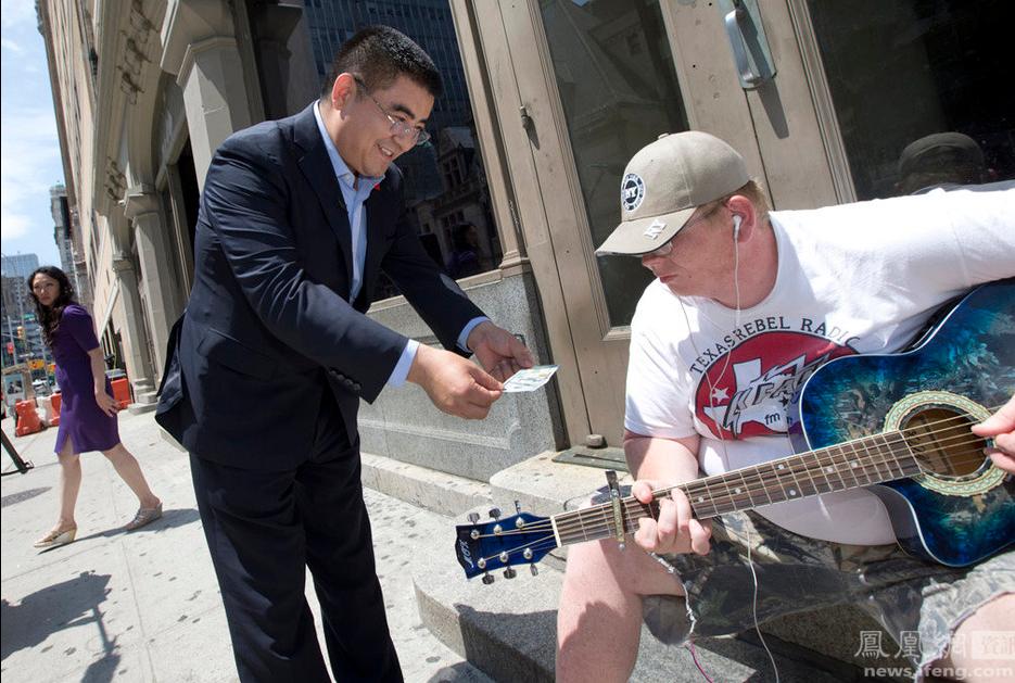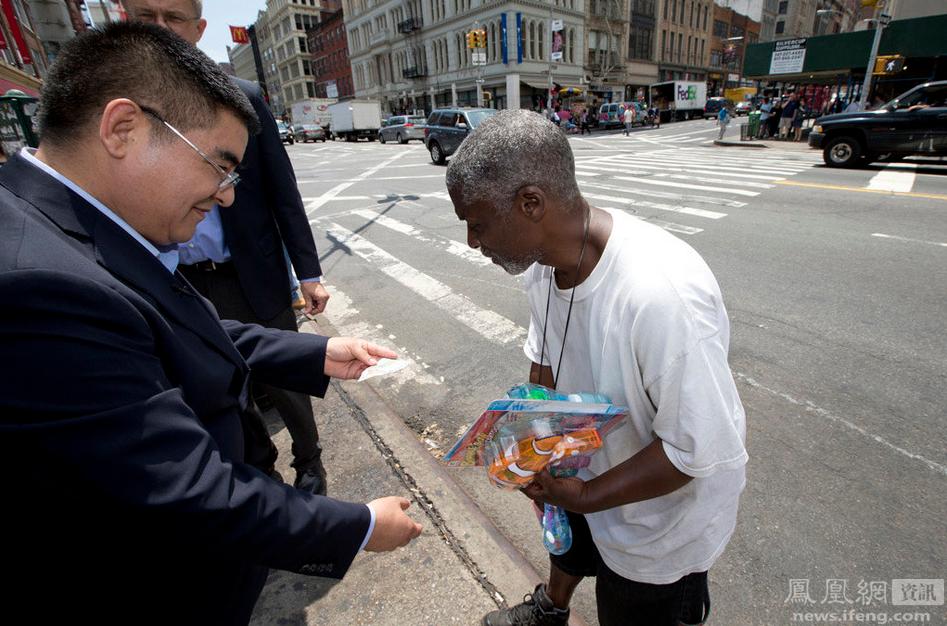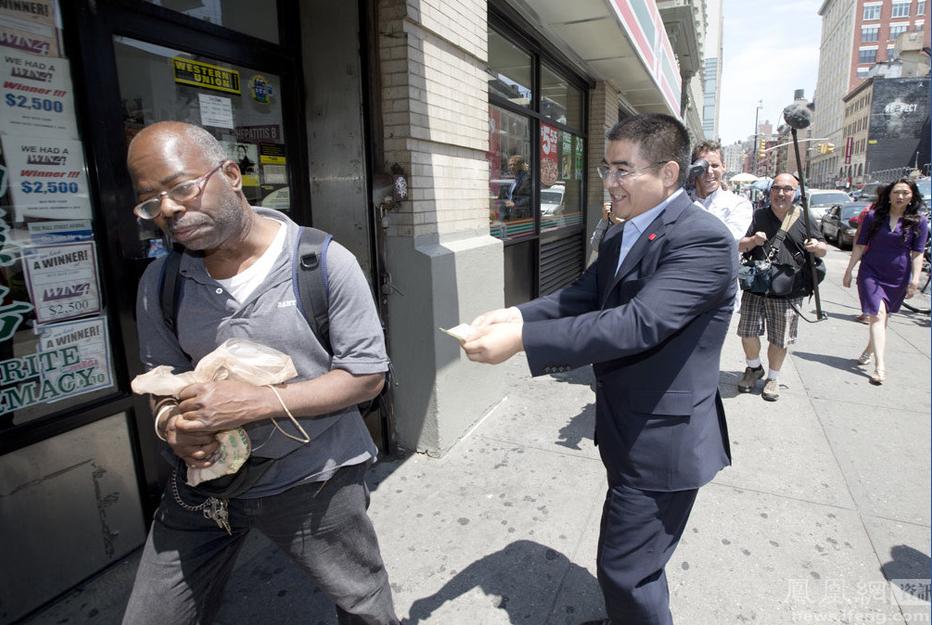 当地时间6月25日,美国纽约,陈光标在纽约街头向流浪汉和街头艺人赠送百元纸币,有的人拒绝了他递过来的钱。一向高调行善的中国富翁陈光标曾在中国大陆、台湾和日本等地多次为灾民和穷人派发现金并引起热议,他本周又宣布将于6月25日在世界上富豪最多的纽约曼哈顿地区邀请流浪汉共进午餐并每人发放300美元现金,再次一石激起千层浪,引起中国国内民众和欧美主流媒体的关注和热议。