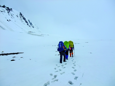 在走过戈壁后,陈凯又穿过了密林,期间遭遇了大风雪,滞留了一天。5月23日,一行人再次出发,这一天穿越的是峡谷。