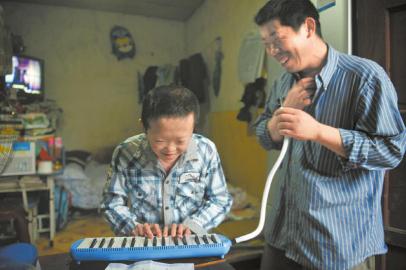 保鲜膜男孩出院后,精神状态很好。小良陈十分开心地和爸爸练习吹口风琴。