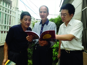 杨峻岭(右一)和叔叔杨摄万(中间者)、父亲杨技万(左一)在翻看家谱
