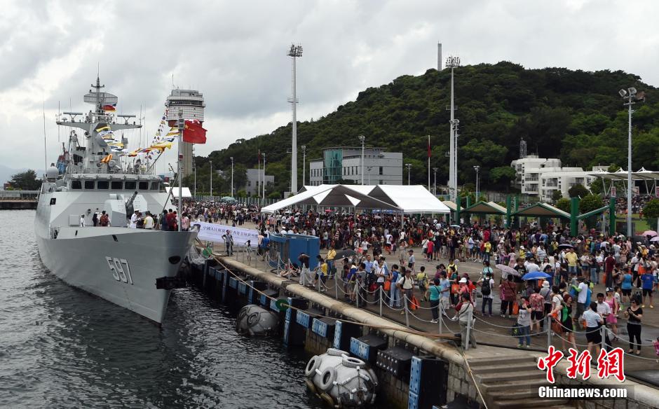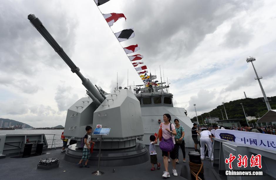 7月1日,中国人民解放军驻香港部队昂船洲军营对公众开放,并进行猎人战斗演练、刺杀团体操训练等表演,同时开放惠州舰、钦州舰、南海艇给公众参观。图为公众参观钦州舰。中新社发 张宇 摄