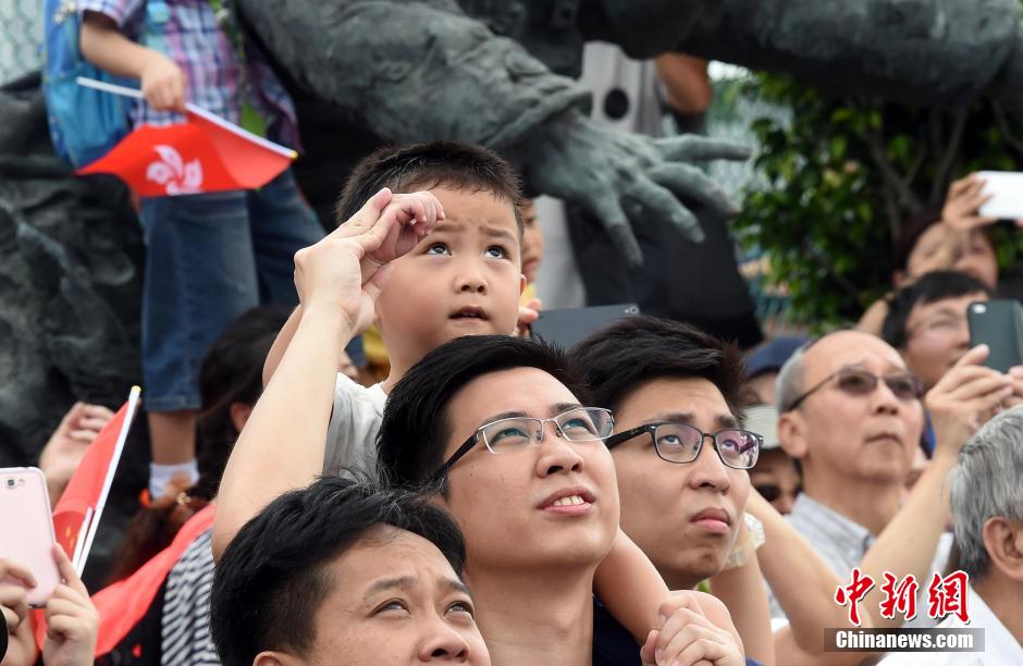 7月1日,中国人民解放军驻香港部队昂船洲军营对公众开放,并进行猎人战斗演练、刺杀团体操训练等表演,同时开放惠州舰、钦州舰、南海艇给公众参观。图为升旗仪式时,市民指导孩子敬军礼。参观期间,有市民表示希望子女能学习军纪。中新社发 张宇 摄