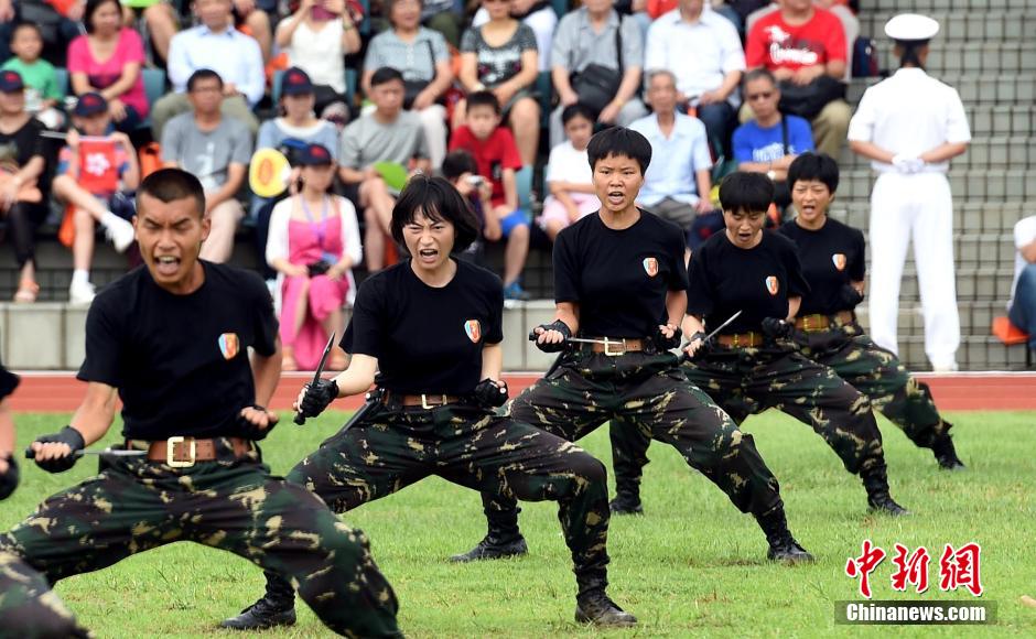 7月1日,中国人民解放军驻香港部队昂船洲军营对公众开放,并进行猎人战斗演练、刺杀团体操训练等表演,同时开放惠州舰、钦州舰、南海艇给公众参观。图为女兵格斗训练表演。中新社发 张宇 摄
