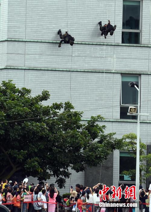 7月1日,中国人民解放军驻香港部队昂船洲军营对公众开放,并进行猎人战斗演练、刺杀团体操训练等表演,同时开放惠州舰、钦州舰、南海艇给公众参观。图为猎人战斗演练中士兵飞檐走壁。中新社发 张宇 摄