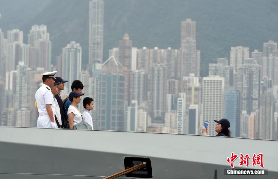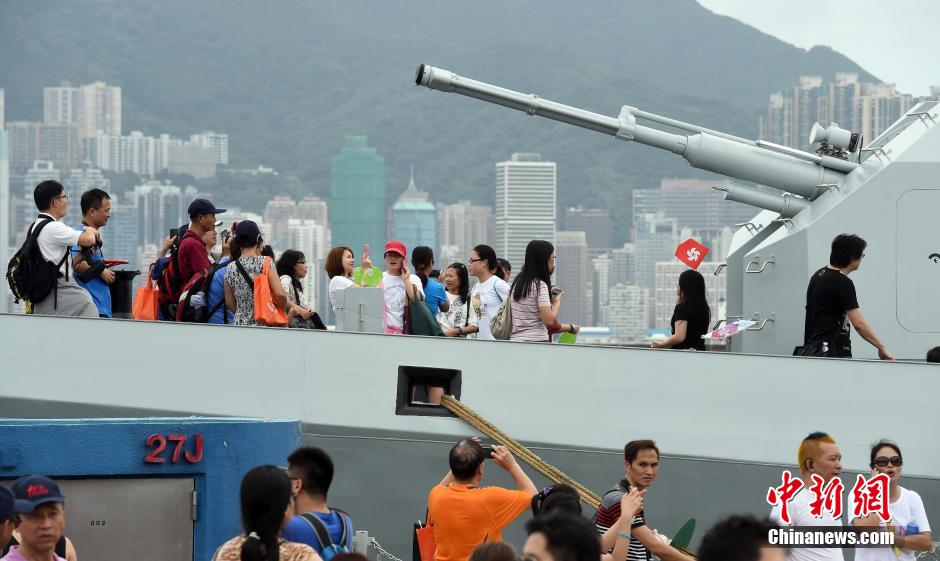 7月1日,中国人民解放军驻香港部队昂船洲军营对公众开放,并进行猎人战斗演练、刺杀团体操训练等表演,同时开放惠州舰、钦州舰、南海艇给公众参观。图为市民参观钦州舰时,争相与海军合影。中新社发 张宇 摄