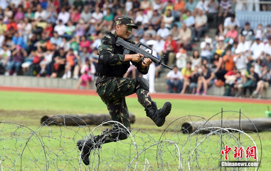 7月1日,中国人民解放军驻香港部队昂船洲军营对公众开放,并进行猎人战斗演练、刺杀团体操训练等表演,同时开放惠州舰、钦州舰、南海艇给公众参观。图为猎人战斗演练中,士兵跳跃铁丝网。中新社发 张宇 摄