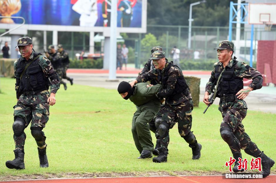 7月1日,中国人民解放军驻香港部队昂船洲军营对公众开放,并进行猎人战斗演练、刺杀团体操训练等表演,同时开放惠州舰、钦州舰、南海艇给公众参观。图为猎人战斗演练中,抓获“歹徒”。中新社发 张宇 摄