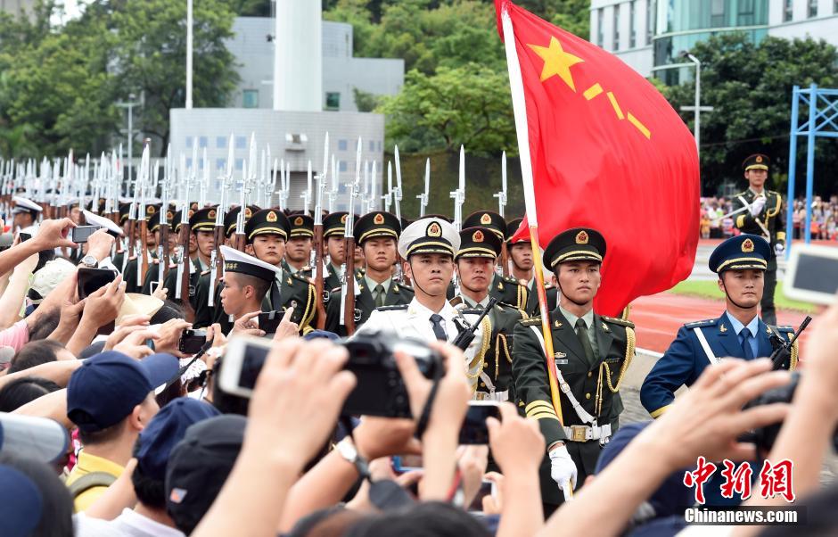 7月1日,中国人民解放军驻香港部队昂船洲军营对公众开放,并进行猎人战斗演练、刺杀团体操训练等表演,同时开放惠州舰、钦州舰、南海艇给公众参观。图为解放军三军仪仗队入场,市民争相拍照。中新社发 张宇 摄