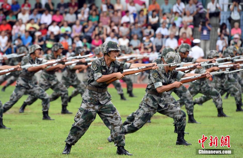 7月1日,中国人民解放军驻香港部队昂船洲军营对公众开放,并进行猎人战斗演练、刺杀团体操训练等表演,同时开放惠州舰、钦州舰、南海艇给公众参观。图为刺杀团体操训练。中新社发 张宇 摄