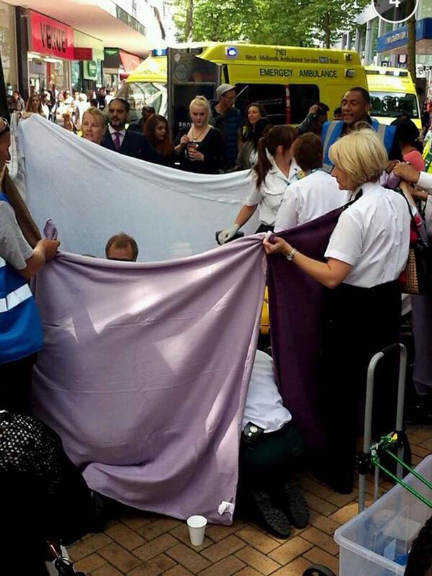 英国伯明翰市一女子逛街时当街产子,救护人员拉床单建临时产房。(网页截图)