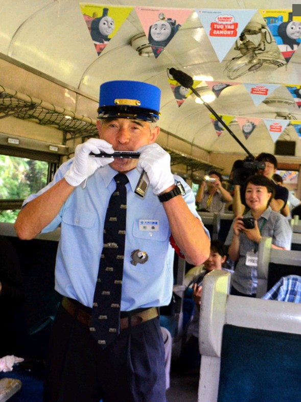 日本静冈县大井川铁道公司开通“托马斯号”蒸汽机车,列车员为人们吹奏口琴(网页截图)