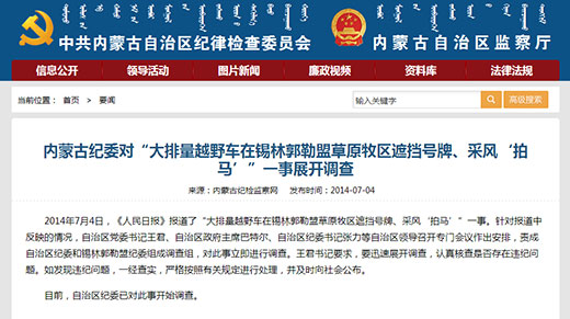 人民网呼和浩特7月4日电(记者 白建平)2014年7月4日,《人民日报》报道了“大排量越野车在锡林郭勒盟草原牧区遮挡号牌、采风‘拍马’”一事。记者4日从内蒙古自治区纪检监察网获悉,针对报道中反映的情况,自治区党委书记王君、自治区政府主席巴特尔、自治区纪委书记张力等自治区领导召开专门会议作出安排,责成自治区纪委和锡林郭勒盟纪委组成调查组,对此事立即进行调查。王君书记要求,要迅速展开调查,认真核查是否存在违纪问题。如发现违纪问题,一经查实,严格按照有关规定进行处理,并及时向社会公布。