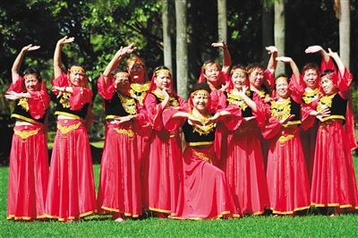 “远方的客人快下马,请你尝块哈密瓜;远方的客人快下马,请你尝块哈密瓜……”伴着新疆歌曲《请你尝块哈密瓜》的欢快节奏,在毗邻海口椰海大道的凤翔花园小区楼下,十几名中老年大妈合着节拍翩翩起舞。领舞的是一位身着鲜艳的“艾德莱斯绸”长裙的维吾尔族大妈,如美丽的蝴蝶般前后穿梭,成为一道靓丽的风景线。
