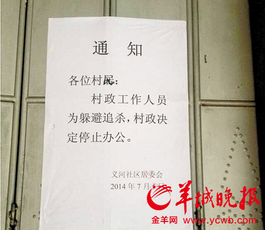 据揭阳榕城区东兴街道义河社区的居民反映,从本月4日起,义河社区居委会就“关门大吉”了,没有任何工作人员上班,街坊们也无法到该处办理任何业务,在该居委会的办公楼大门上贴有这样一份告示,其中称,“村政工作人员为躲避追杀,村政决定停止办公”,落款时间为7月5日。