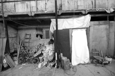 7月3日,记者来到小文住处,发现一家人居住在彩钢板房深处的一间小屋,屋内堆放着废旧饮料瓶和旧铁块儿,用塑料布密封的窗户下,一堆碎砖块上架起一张木板,铺张席子就成一张床。