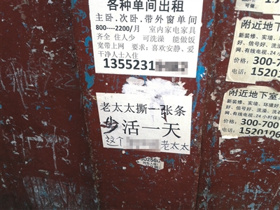 “有疏才有导!我们不可能完全禁止小广告。为了不让小区哪儿都是小广告,我们特地开辟了很多公告栏专门用来张贴小广告。”罗庄社区居委会的卫生主任刘先生告诉北青报记者,尽管居委会想用设置公告栏这种方式来消除这种到处都是小广告的现象,让小广告变得合理有序,但是效果却不甚乐观,整个社区依然被小广告包围。