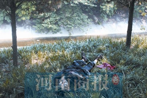 昨天上午10点左右,一名女士从郑州顺河北街金水河桥南经过,发现了躺在草坪上、血流如注的他,便报了警。河南商报记者赶到现场时发现,袁伟斜躺在草地上,沾血的右手放在胸前,脸色已经发青。在他身旁有一个红色的手提袋,民警打开,在里面找到了带血的刀,袁伟就是用这把刀切开了自己的手腕。