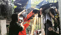 7月15日清晨5点多,青山区一男子宵夜结束准备回家,为抄近路翻越铁栅栏时不慎被栅栏尖处挂住,整个左臂被铁栅栏戳穿。