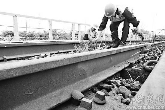图为:一百多年前汉阳钢铁厂生产的铁轨仍在使用 (记者曹大鹏摄)