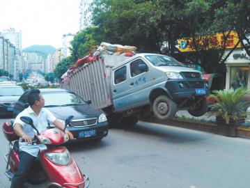 记者到达现场看到,小货车的驾驶室只有一人,正在打电话,约两米长的车厢装载着塑料管道等废旧物品,货物冒出车顶,近1米长的后门也敞开着。等了半小时,货车司机等来了两个同伴。几人推动小货车尾部,车子前轮终于着地。随后,几人把货物往车子前部转移。现场交警也对此事进行了调查取证。据了解,交警部门将对超载的货物进行称重,并将根据超载的幅度做出扣分和罚款处罚。