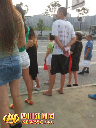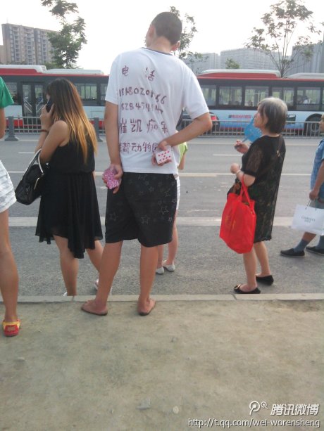 四川新闻网成都7月18日讯(记者 漆奇 摄影报道)近日,成都网友@微-worensheng在腾讯微博上晒出一件奇特的T恤,这件T恤的主人,是一名赤着双脚、神情木讷的年轻男子,T恤的背部写着“崔凯痴呆”“成都动物园”上面还有两组手机号码。网友们看到该微博后发出感叹:“他并不寂寞,因为他把父母的爱穿在身上”。