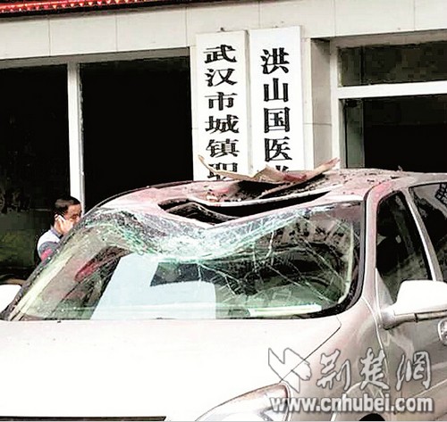 昨晚6时许,记者赶至现场时,伤者已被送往医院救治。记者看到,事发单元楼为一栋15层高的临街居民楼。在一家中医门诊部门口,停着被砸坏的商务车,其天窗和前挡风玻璃全都破碎了,车厢内的血迹尚未干涸(如图)。车辆附近地面上,还散落着混凝土碎块和多根锈蚀发黑的铁栏杆。