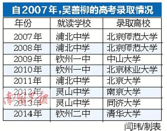 据网帖描述,吴善柳是浦北县北通镇人,现已30多岁,今年在钦州二中参加高考,以680分的成绩夺取钦州市理科状元,被清华大学录取。极富戏剧性的是,他之前辗转浦北中学、灵山中学、钦州一中等多所学校,至今已参加过多次高考,他的名字每年都出现在相关学校的重点大学录取名单中。