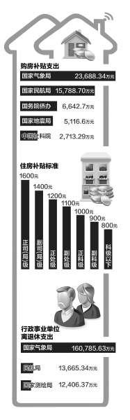 记者梳理95个对外公开2013年度部门决算的中央单位数据,发现部分单位用于“行政事业单位离退休”“购房补贴”“提租补贴”等项目的支出金额较大,一些大户支出资金以十数亿计。比如,国家气象局用于行政事业单位离退休的支出超过16亿,用于职工购房补贴为2.3亿元。