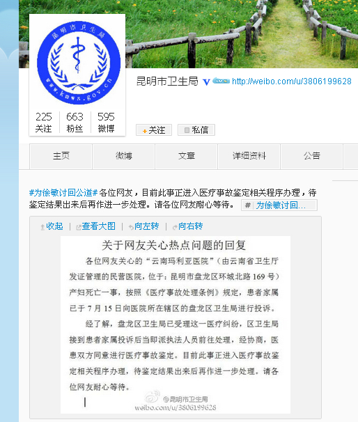 人民网北京7月18日电 近日,一封写给云南昆明盘龙区卫生局的控告信在网上引起广泛关注,作者在信中称其妻子在玛莉亚医院产房分娩中抢救无效身亡,怀疑医院在抢救过程中存在严重失误。昆明市卫生局官方微博今日回应称,目前此事正进入医疗事故鉴定相关程序办理,待鉴定结果出来后再作进一步处理。