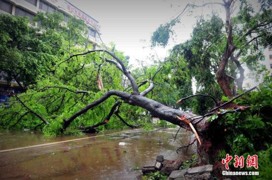 7月19日,受超强台风“威马逊”影响,徐闻县区到处可见折断倒地的树木。7月18日晚,今年第9号台风“威马逊”(超强台风级)在广东省徐闻县市龙塘镇沿海再次登陆,登陆时中心附近最大风力仍有17级(60米/秒),是41年来登陆中国华南地区的最强台风。中新社发 陈骥旻 摄