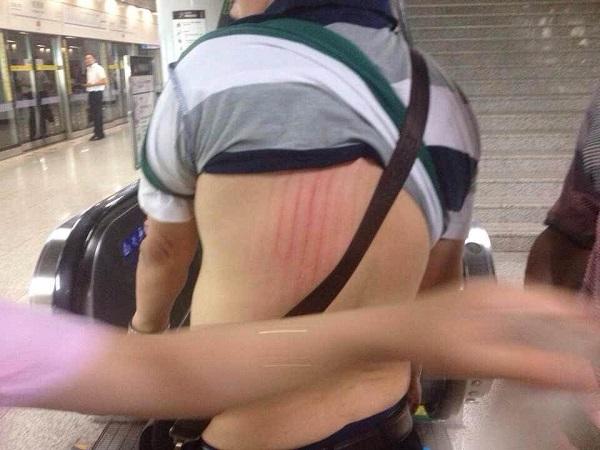 岳先生回忆,女乘客后面紧跟着一位老先生、岳先生的朋友、老先生的儿媳妇等人。事发时,女乘客的行李箱忽然向下滚,并砸中后面乘客,导致后方乘客往下跌滚。