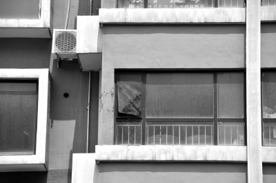 昨天上午11点,泰河园七里小区5号楼403室朝南的窗户向里打开着,破损的纱窗和窗外的墙壁上仍留有血迹。